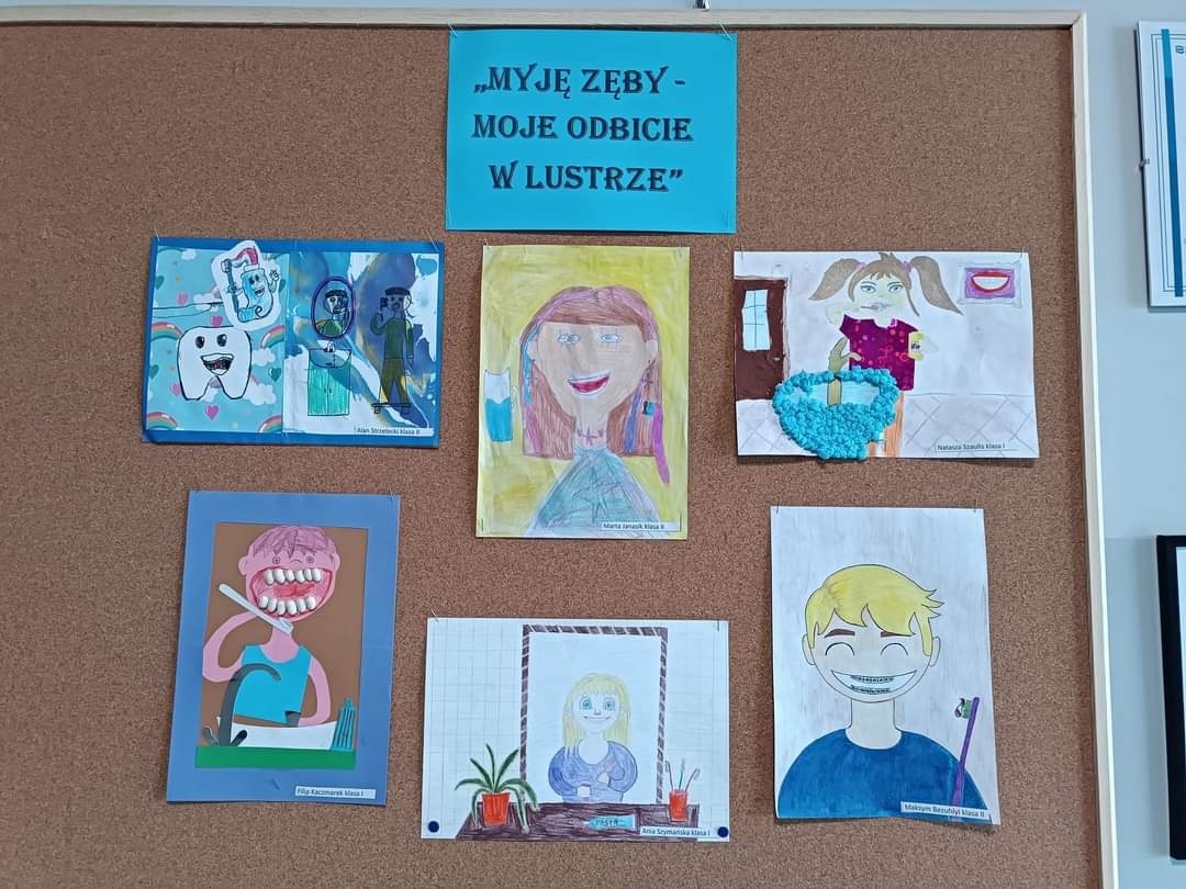 Uczniowie z klas I i II wzięli udział w konkursie organizowanym przez Powiatową Stację Sanitarno - Epidemiologiczną w Środzie Wielkopolskiej pt. "Myję zęby - moje odbicie w lustrze". Pierwsze miejsce w etapie szkolnym zajęli: Oskar Pankowski z klasy I oraz Lena Łasecka z klasy II. Ich prace przeszły do kolejnego, powiatowego etapu konkursu . Gratulujemy 🏆 Wybór był bardzo trudny, ponieważ wszystkie prace były bardzo ciekawe. Pozostałe dzieci biorące udział w konkursie otrzymały dyplomy i słodki upominek. Brawo 👏