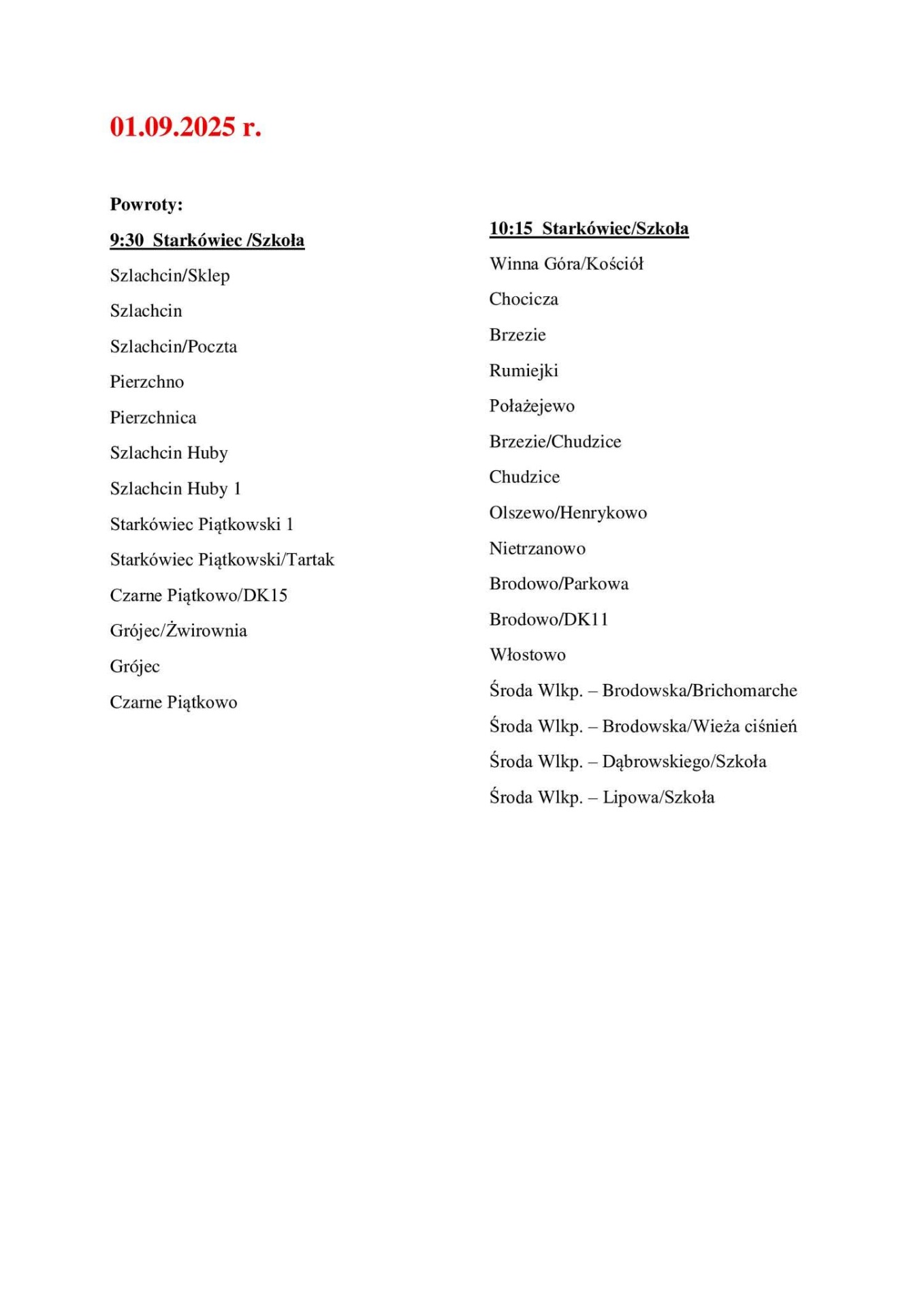 W tym dniu dla wszystkich uczniów obowiązują poniższe godziny odwozów.